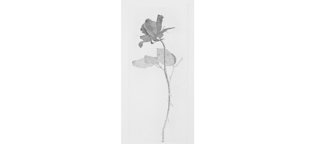 18. The Rose and Rose Stalk (1969), de David Hockney. Es uno de los 39 grabados que Hockney hizo para el libro Six Fairy Tales from the Brothers Grimm (1970), la selección de los cuentos también es suya. Se dedicó un año entero a este trabajo y empleó tres técnicas distintas: aguafuerte, aguatinta y punta seca. Esta rosa ilustra el cuento «Fundevogel», conocido en castellano como «Piñoncito». En varias entrevistas Hockney confiesa ser un enamorado desde muy chico de estos cuentos, y agrega: «Estas pequeñas historias son fascinantes, contadas en un lenguaje y un estilo muy, muy simples, directos y sencillos. Fue esta simplicidad lo que me atrajo. Cubren una gama bastante extraña de experiencias, desde lo mágico hasta lo moral».
