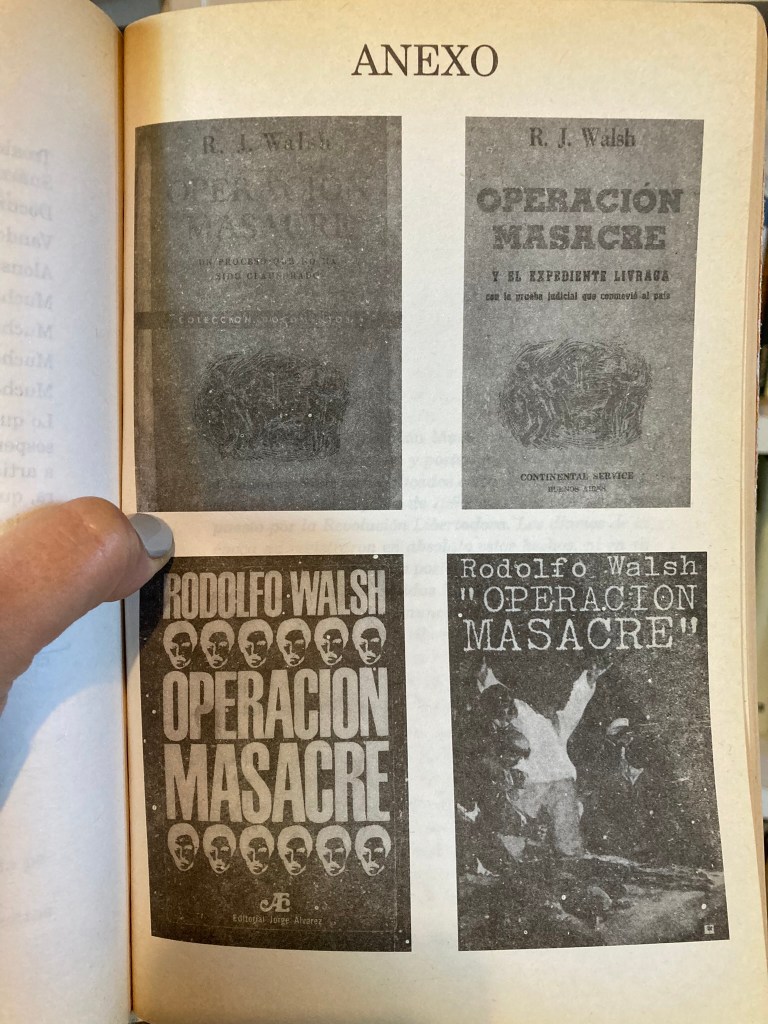 Volviendo a Operación Masacre, creo, por último, que el impacto que me causó fue doble. Más allá de todo lo expuesto anteriormente, recuerdo que el libro me generó mucha curiosidad desde otros aspectos: ¿qué quería decir eso de la “edición definitiva” que se anunciaba desde la cubierta?; ¿por qué era un libro con tantas ediciones, qué implicancias tenía eso?; ¿cómo se dio la traspolación del libro al cine?; ¿por qué se incluía un apéndice con una parte del guion de la película?; ¿para qué se reproducían las cubiertas de las ediciones anteriores?