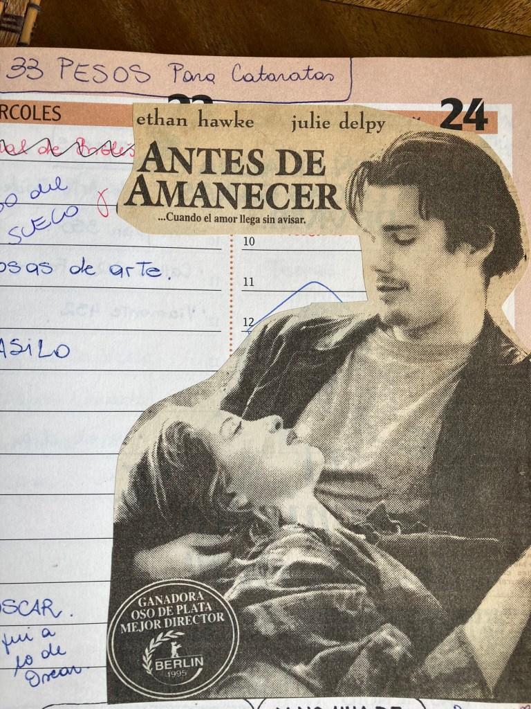 Coda I. ¿Cómo elegir una sola historia de amor del cine? Juego el juego y disparo: Jesse y Céline, de la trilogía de Richard Linklater protagonizada por Ethan Hawke y Julie Delpy: Antes del amanecer (1995), Antes del atardecer (2004) y Antes del anochecer (2013). Son dos personajes inolvidables y los diálogos son honestos, ocurrentes, bellísimos. La primera la fui a ver sola al cine, así quedó registrado en mi agenda de 1995.