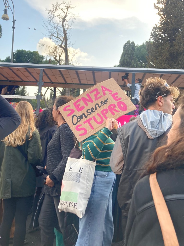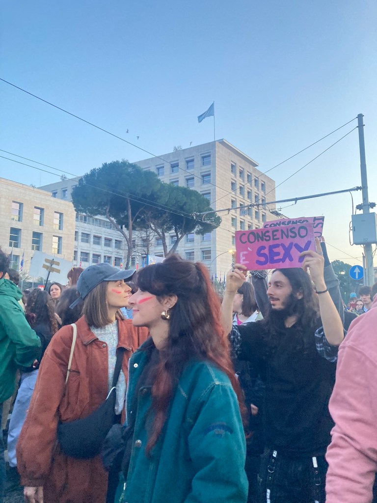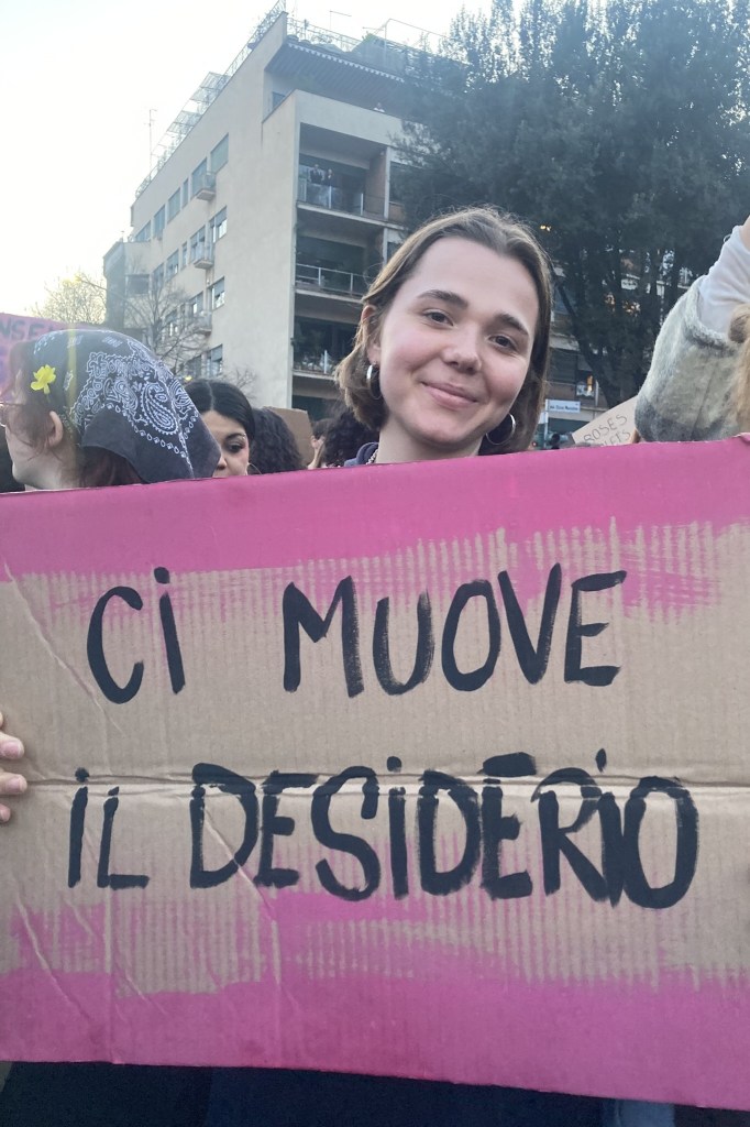 Coda 2. Pasé el 8M en Roma. Una fiesta hermosa y raramente organizada, como guionada, al menos bajo mi mirada porteña. Había muchos hombres acompañando a sus parejas mujeres (lo sospecho por gestos sexoafectivos que compartían). Lo conversé durante la marcha con algunas mujeres, compartí tímidamente mi sorpresa, a lo que en diferentes ocasiones me respondieron que estaba todo bien con que participaran. Esto no es una muestra significativa, por supuesto, pero no deja de ser la respuesta que recibí de varios grupos a los que me acerqué. En principio pienso que ese día los hombres bien pueden hacer otra cosa que estar en la marcha, pero sinceramente estoy abierta a escuchar otras opiniones y repensar las mías.